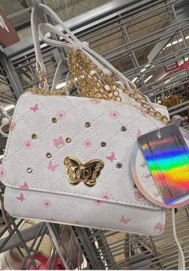 A charming white handbag featuring a butterfly design and decorative studs. It has a chain strap for easy carrying.