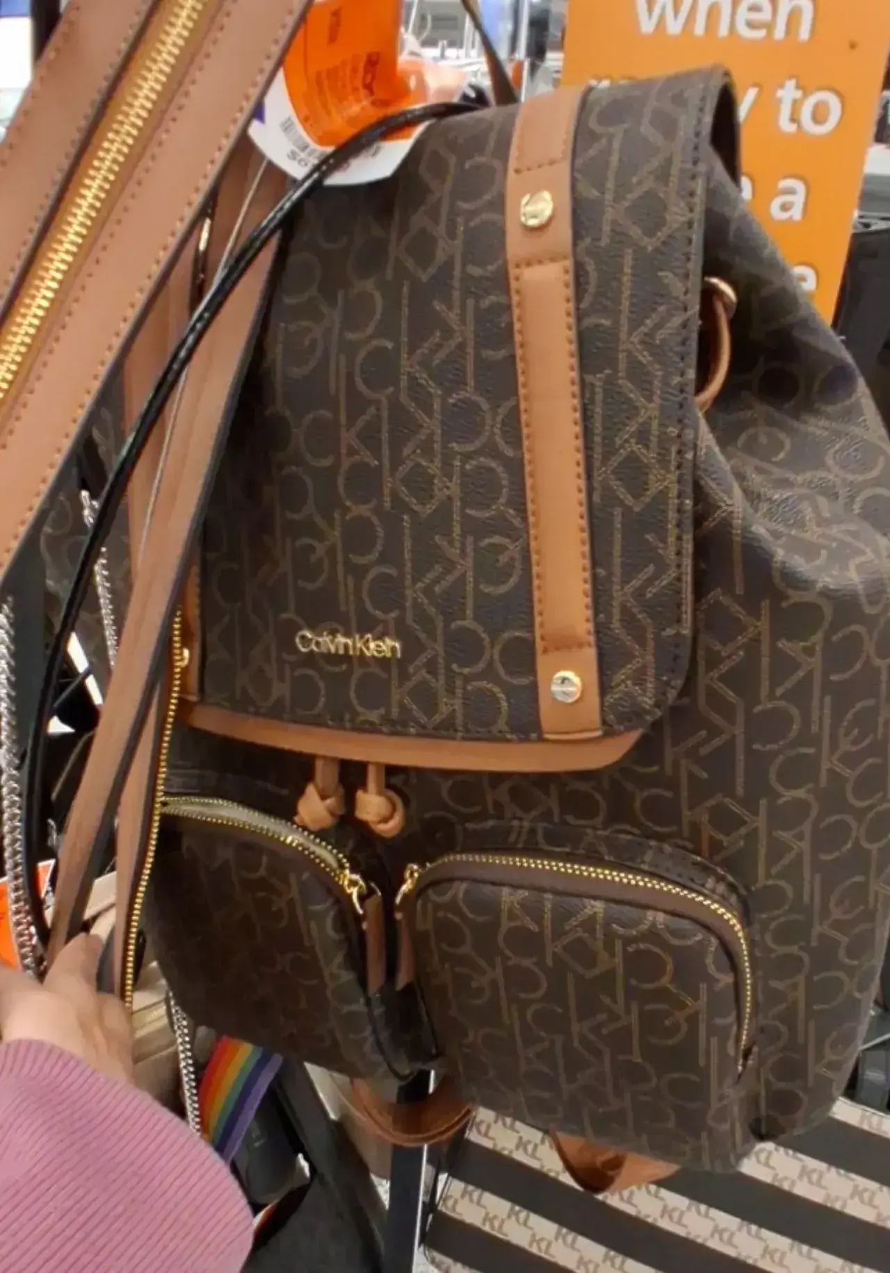 A stylish Calvin Klein backpack featuring a signature logo pattern and multiple pockets for organization.