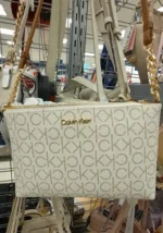 A stylish Calvin Klein handbag featuring a signature logo pattern and a chain strap.