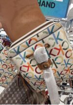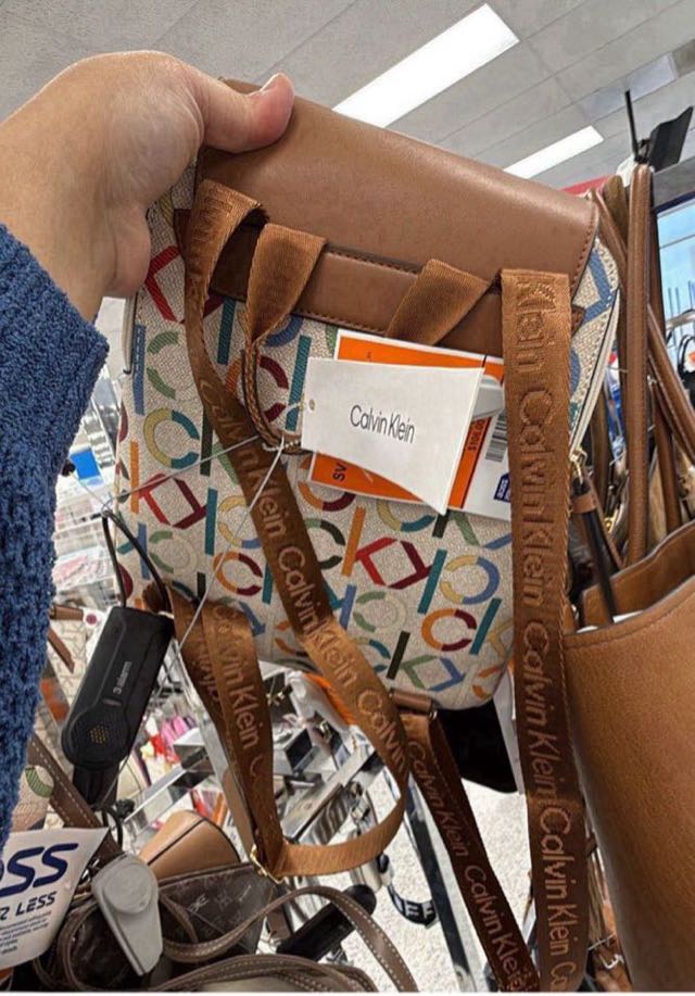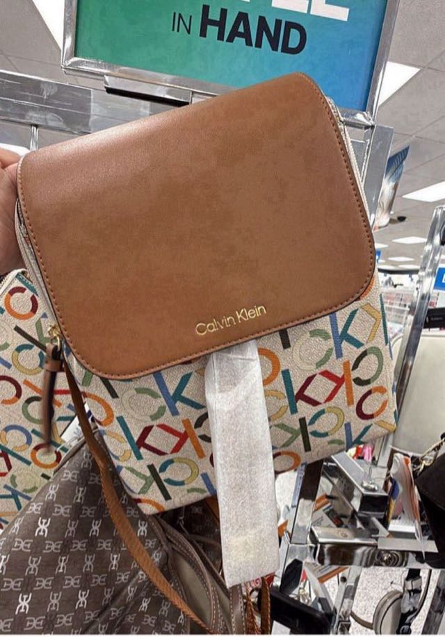 A stylish handbag featuring a colorful logo design and a smooth brown flap. Perfect for everyday use.