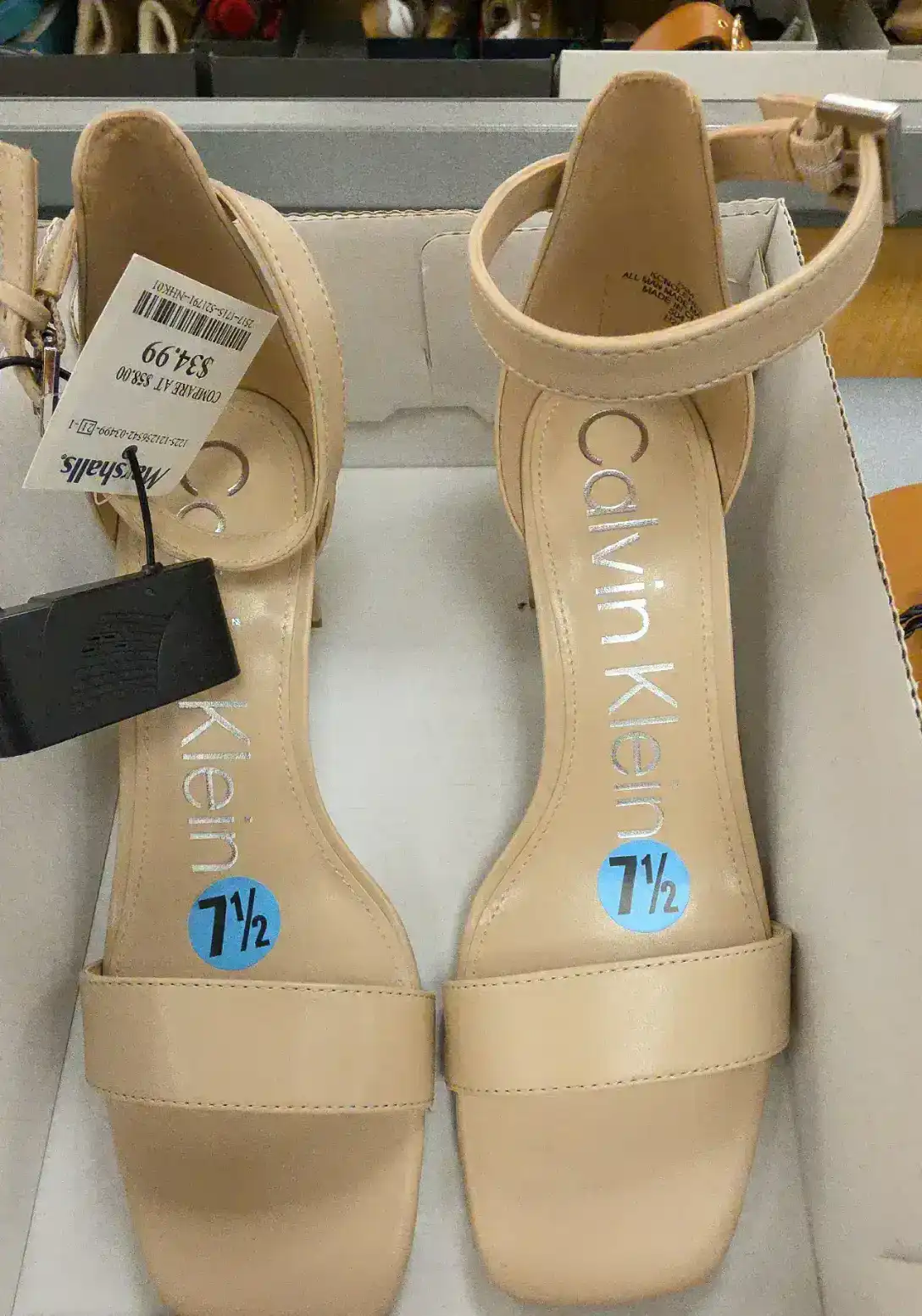 Stylish nude heeled sandals with ankle strap from Calvin Klein.