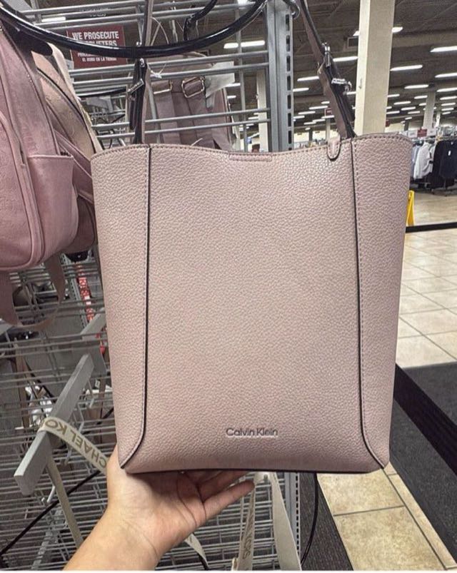 A stylish pink tote bag made from textured material, featuring a minimalist design with the Calvin Klein logo.