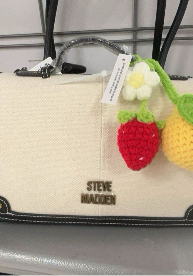 A stylish canvas handbag featuring a decorative crochet fruit charm.
