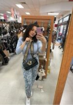 A stylish casual outfit featuring a light blue top, patterned pants, and a black crossbody bag with a gold emblem.
