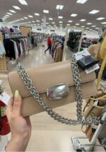 A stylish beige handbag featuring a silver clasp and a chain strap.