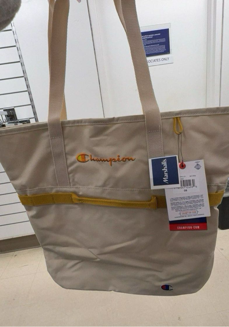 A stylish beige tote bag with yellow accents and the Champion logo.