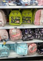 A collection of colorful character-themed backpacks featuring popular designs.