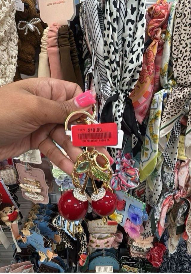 A vibrant cherry-shaped keychain adorned with rhinestones, perfect for adding a playful touch to your keys or bag.