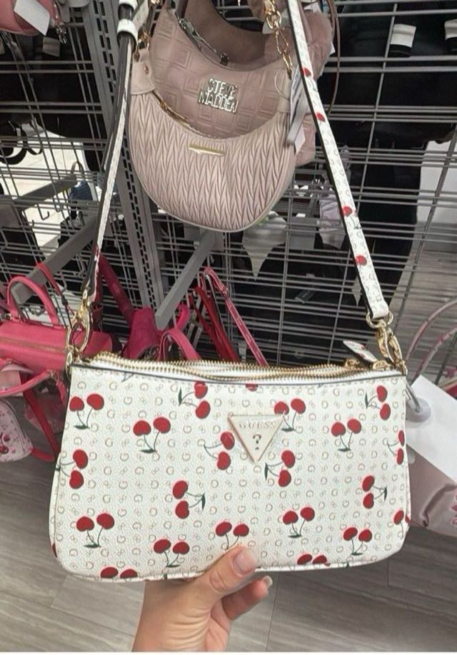 A stylish handbag featuring a playful cherry print design. It includes a detachable strap for versatile carrying options.
