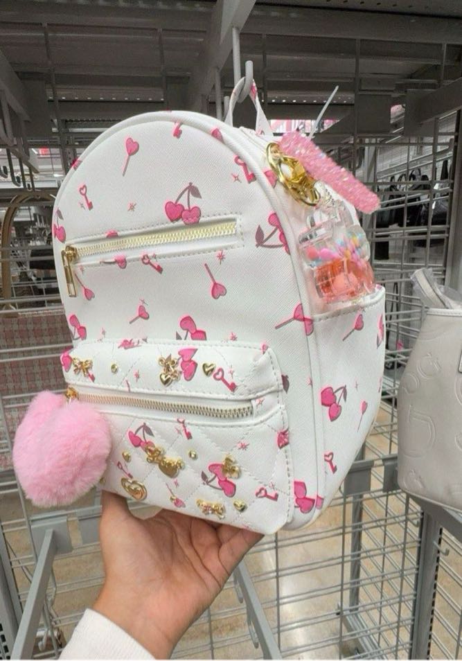 A cute mini backpack featuring a cherry print design with gold accents and a fluffy pink pom-pom.