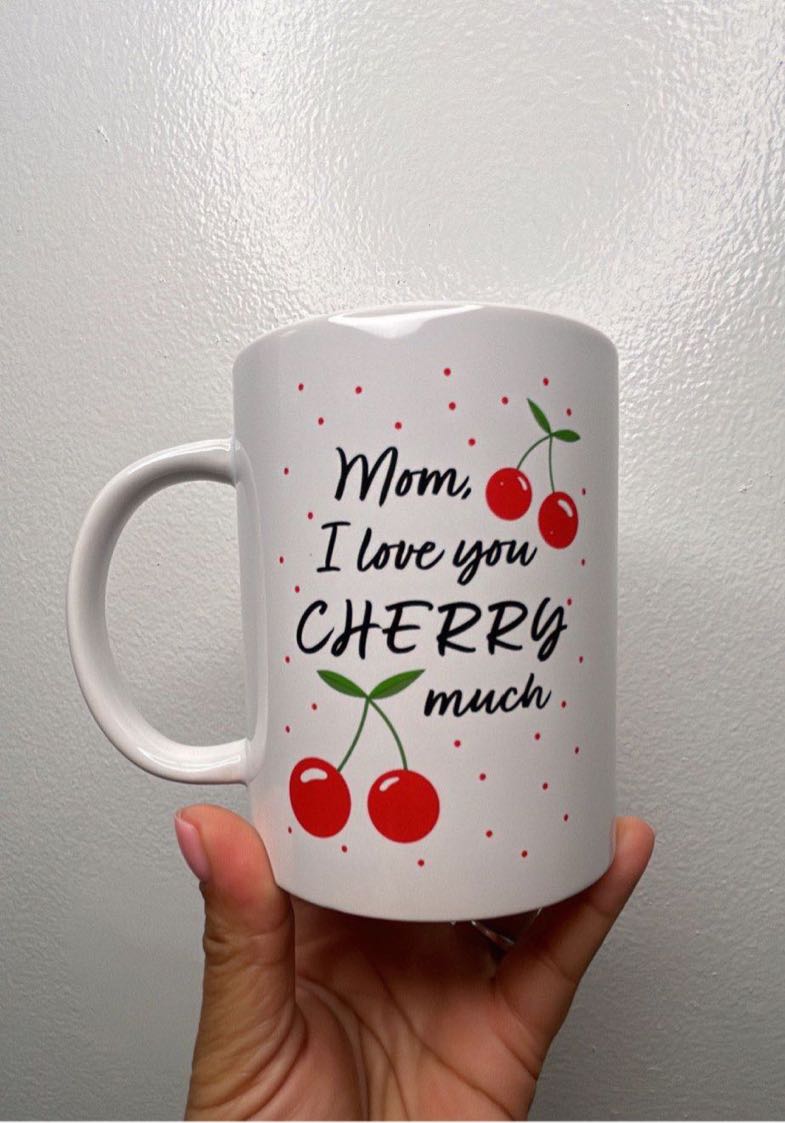 A ceramic mug featuring a playful cherry design with the text ‘Mom I love you CHERRY much.’ Perfect for gifting or personal use.