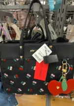 A stylish black tote bag featuring a cherry print design and a heart-shaped keychain.