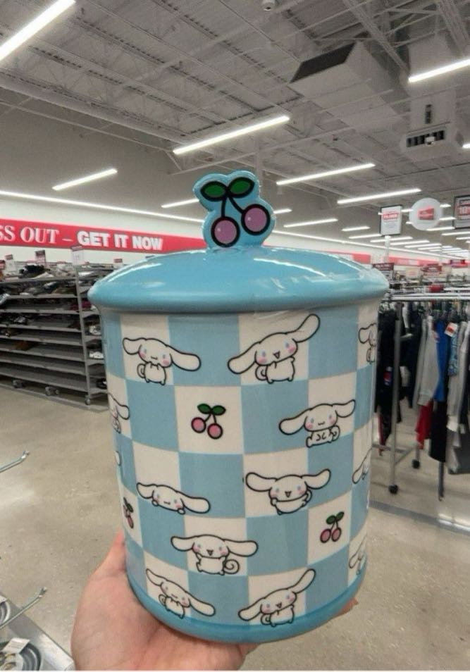 A charming blue canister featuring a playful design with cartoon sheep and cherries on a checkered pattern.