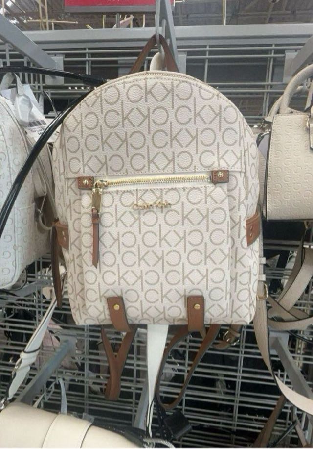 A stylish backpack featuring a repeating CK logo pattern with leather accents.