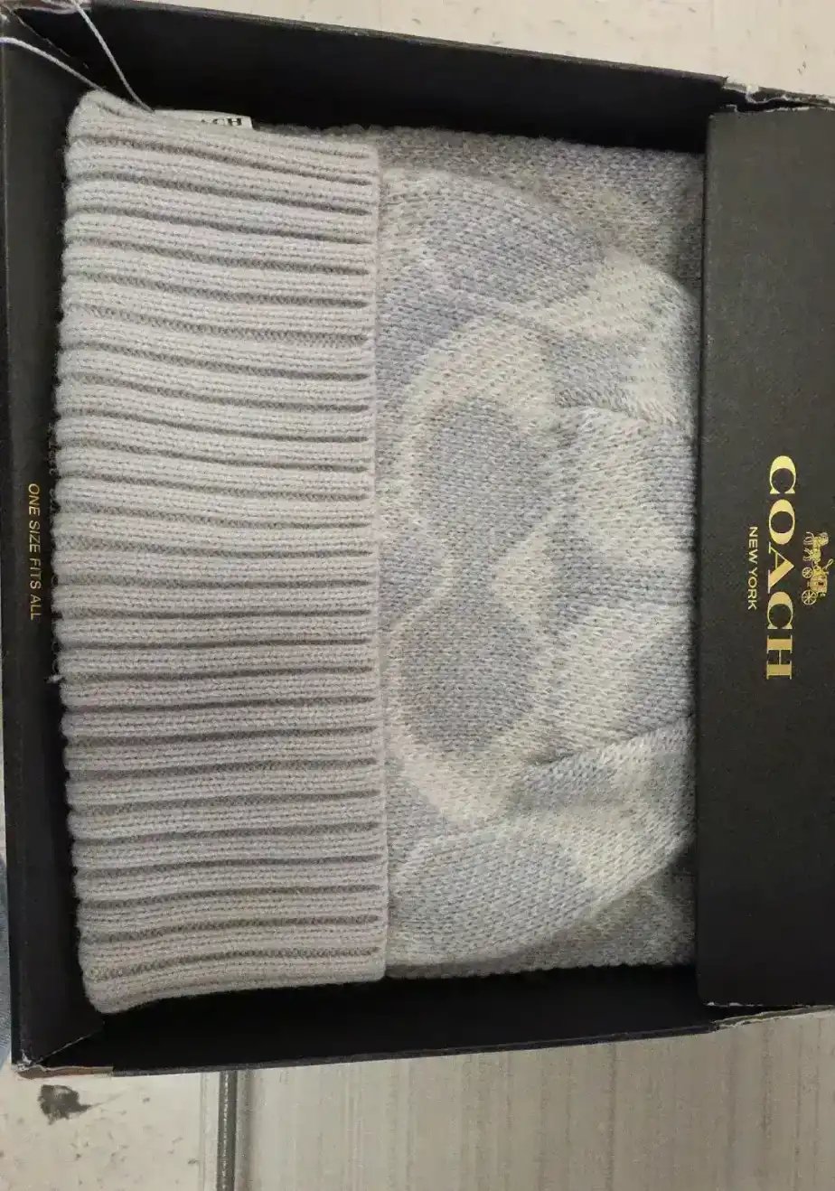 A stylish gray beanie with a textured pattern, packaged in a Coach box.