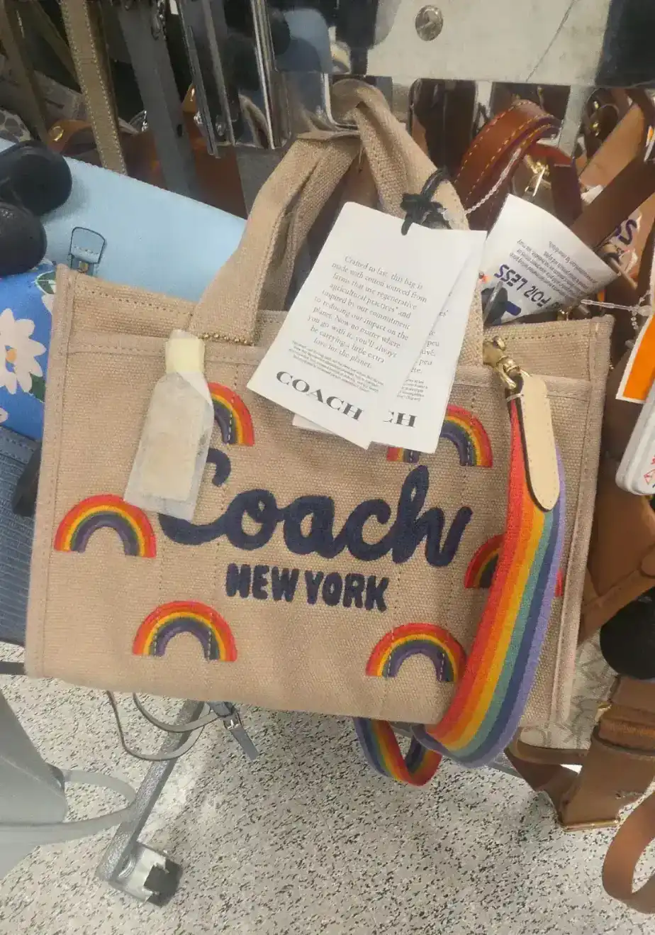 A stylish tote bag featuring a colorful rainbow design and the Coach logo. Perfect for everyday use with a spacious interior.