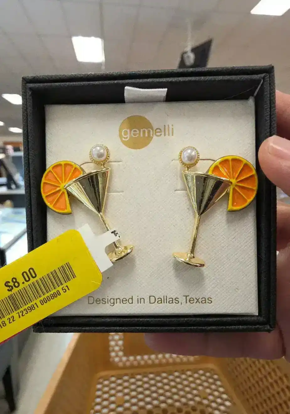 Gold-tone earrings featuring a cocktail glass design with orange slice and pearl accents.