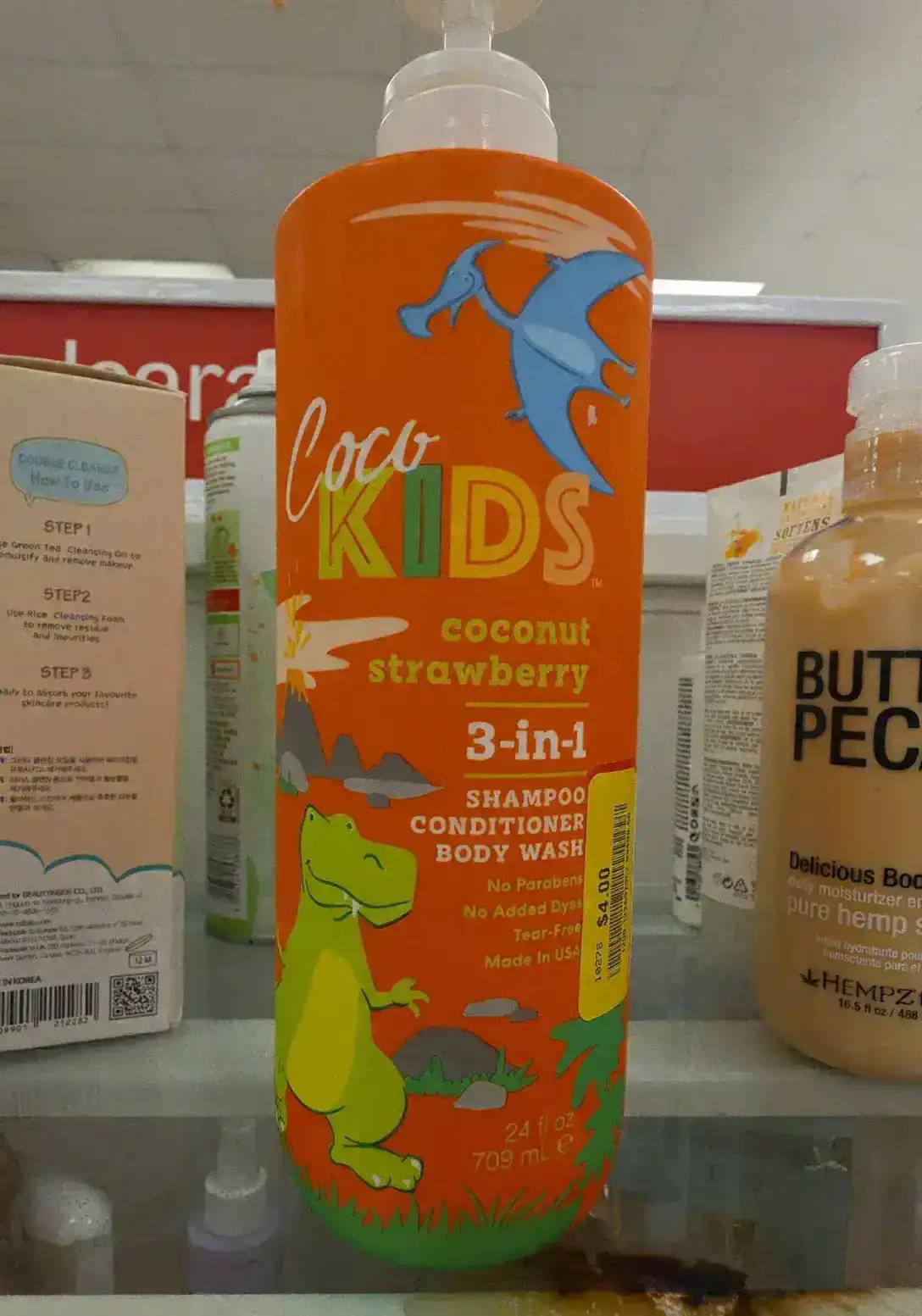 A coconut and strawberry scented 3-in-1 shampoo, conditioner, and body wash for kids.