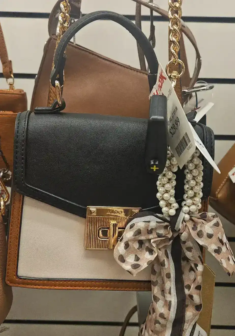 A stylish color block handbag featuring a black top flap and a cream body, adorned with a decorative scarf.