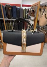 A stylish color block handbag featuring a black, beige, and brown design with a gold chain detail.