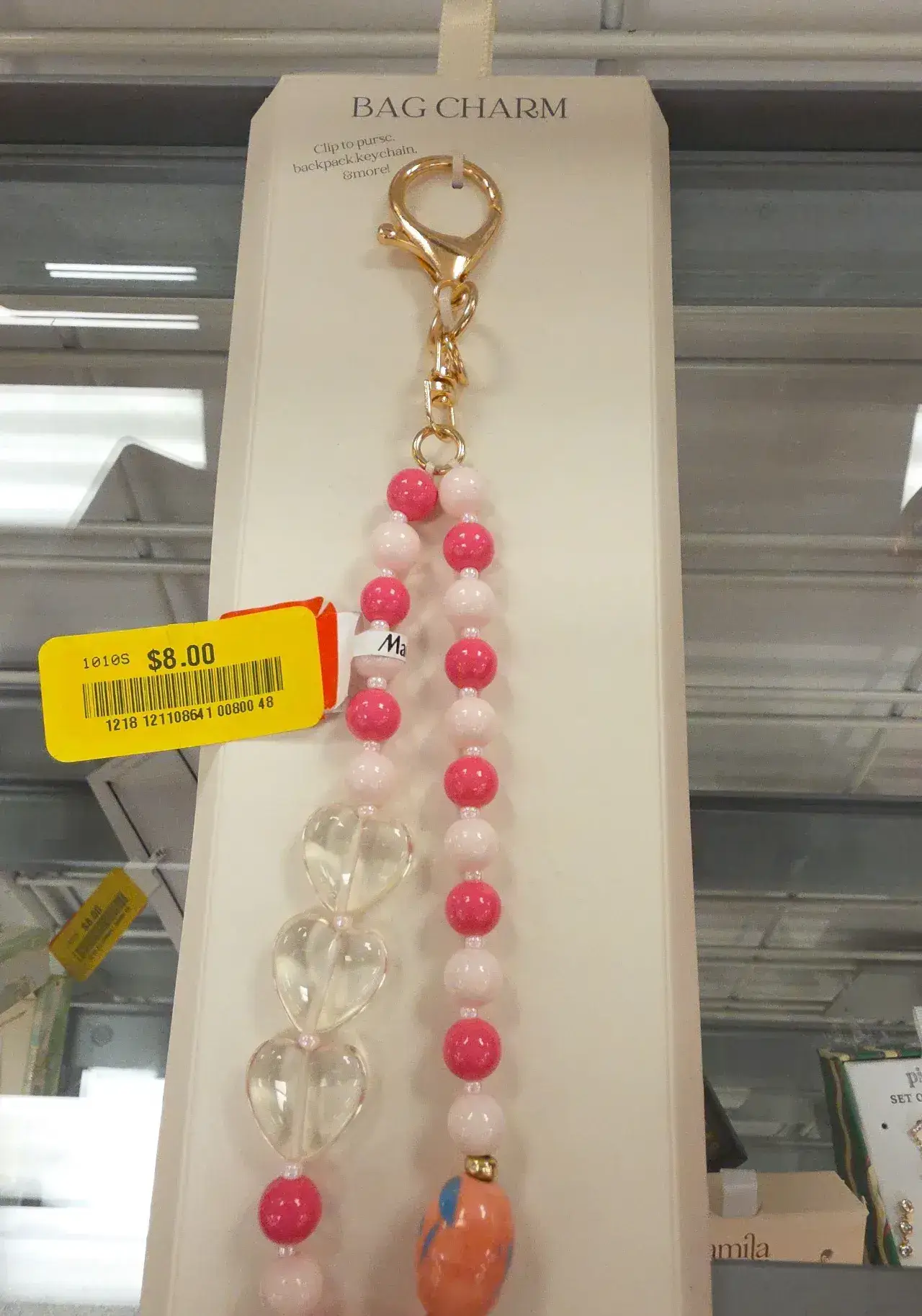A vibrant bag charm featuring pink and white beads, along with decorative elements, perfect for adding a stylish touch to bags.