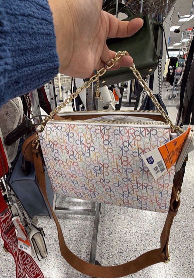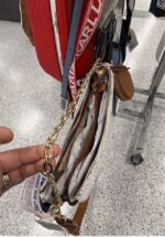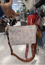 A stylish crossbody bag featuring a colorful logo print and a detachable shoulder strap. It has a structured design with a zippered closure.