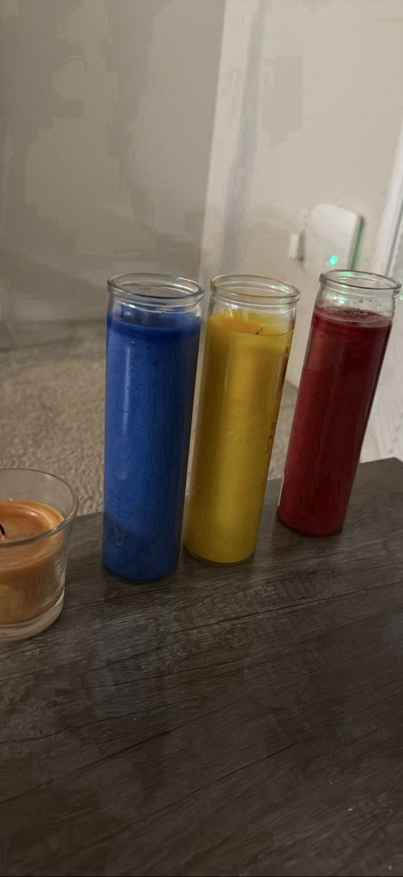 Brighten your space with these vibrant pillar candles in blue, yellow, and red. Perfect for adding a pop of color to any room or for use in special occasions.