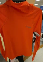 A vibrant orange long-sleeve hoodie designed for outdoor activities.