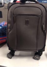 A small, wheeled suitcase with a front pocket, designed for easy travel.