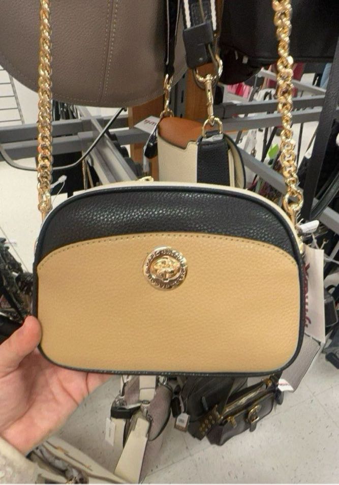 A stylish crossbody bag featuring a combination of beige and black leather with a gold emblem.