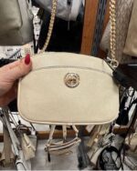 A stylish cream-colored crossbody bag with a chain strap and a decorative logo.