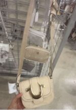 A stylish crossbody handbag featuring a gold-tone hardware accent. The bag has a detachable strap for versatile wear.