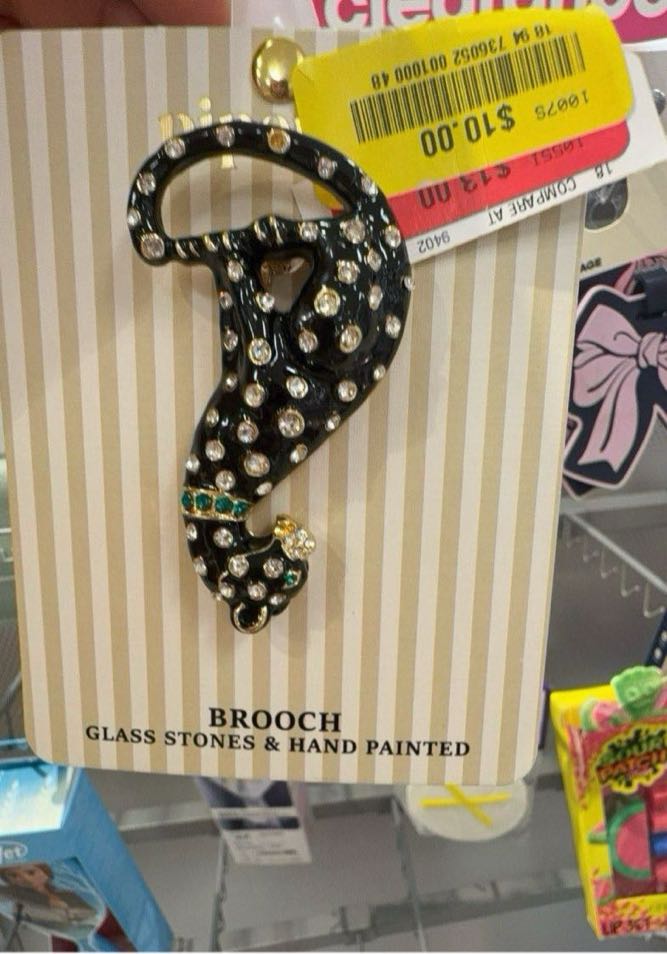 A stylish brooch featuring a unique design with glass stones and hand-painted details.