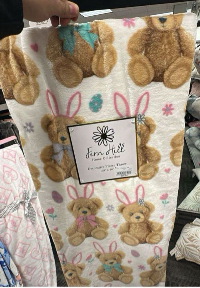 A soft and cozy fleece throw featuring a cute teddy bear design with pastel colors. Perfect for adding warmth and comfort to any space.