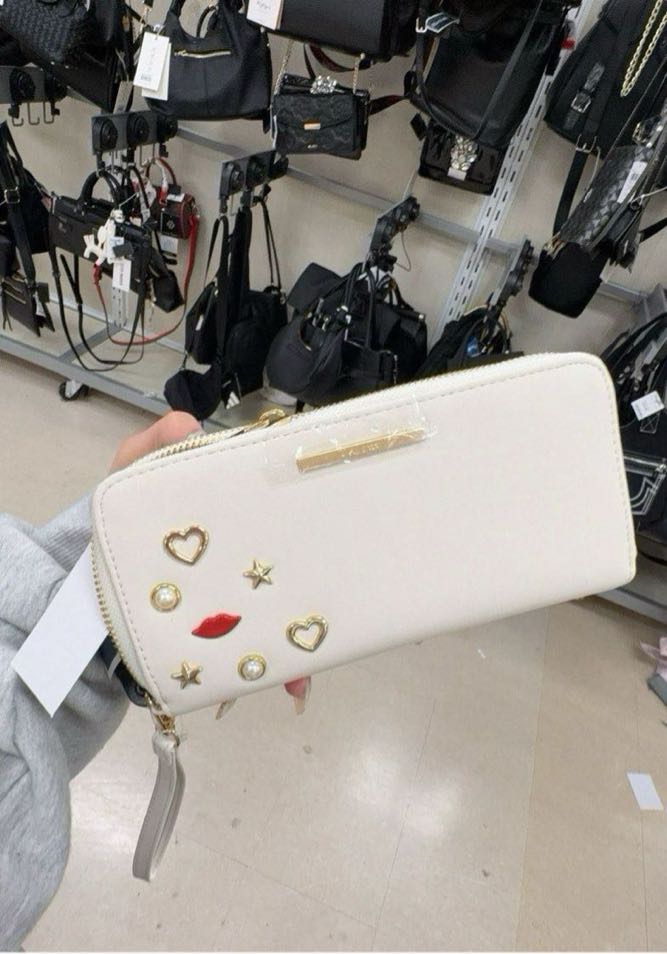 A stylish wallet featuring decorative elements like stars, hearts, and a lip motif.