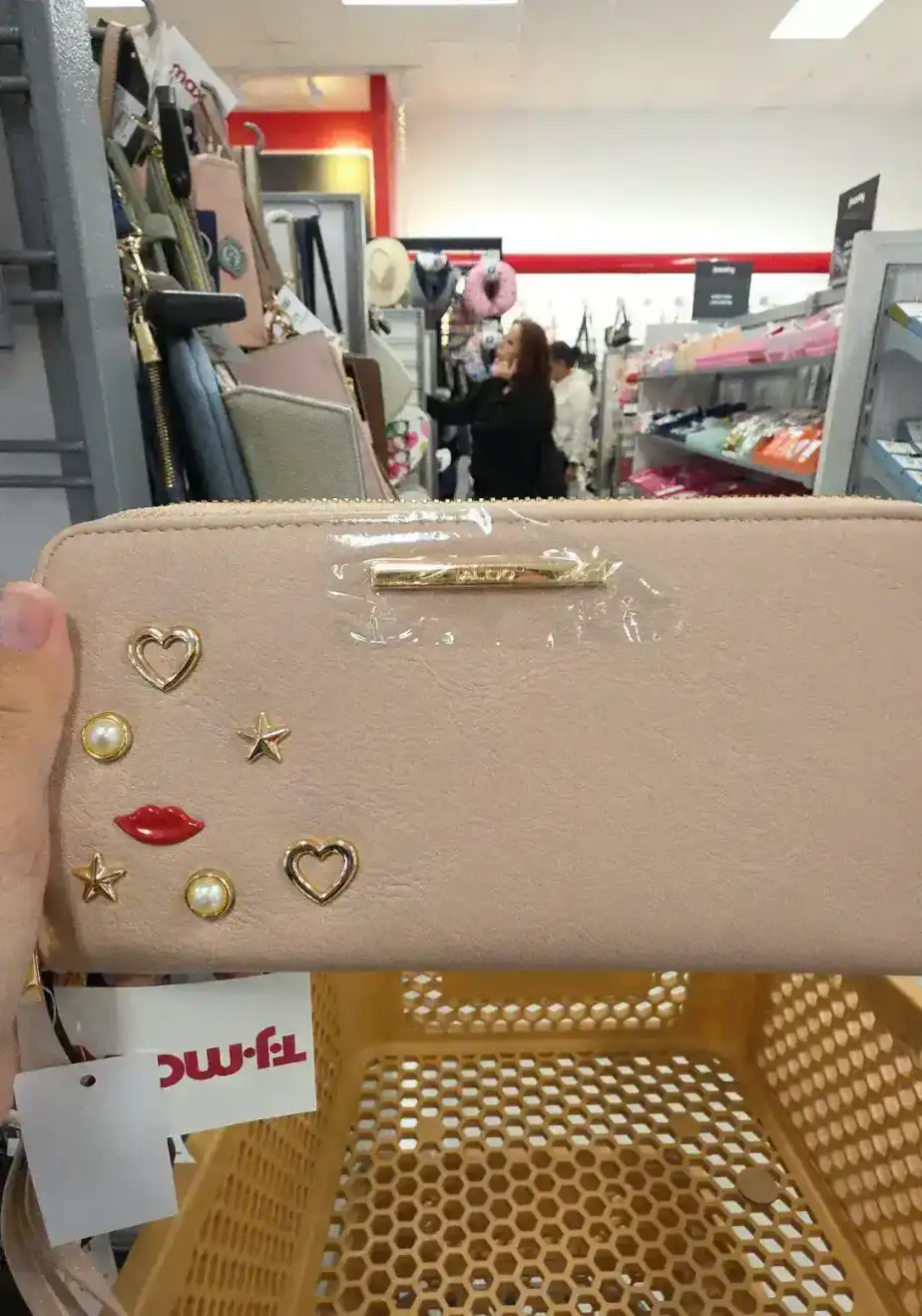 A stylish wallet featuring decorative embellishments including lips, stars, and hearts.