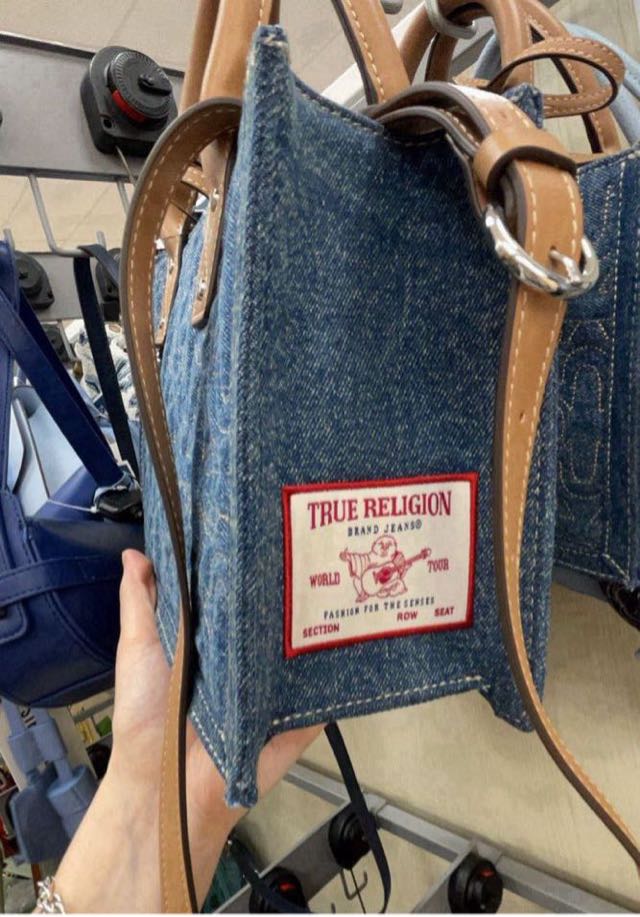 A stylish denim handbag featuring a True Religion label and leather accents.