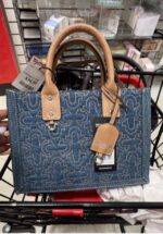 A stylish denim handbag with leather accents and a decorative pattern.