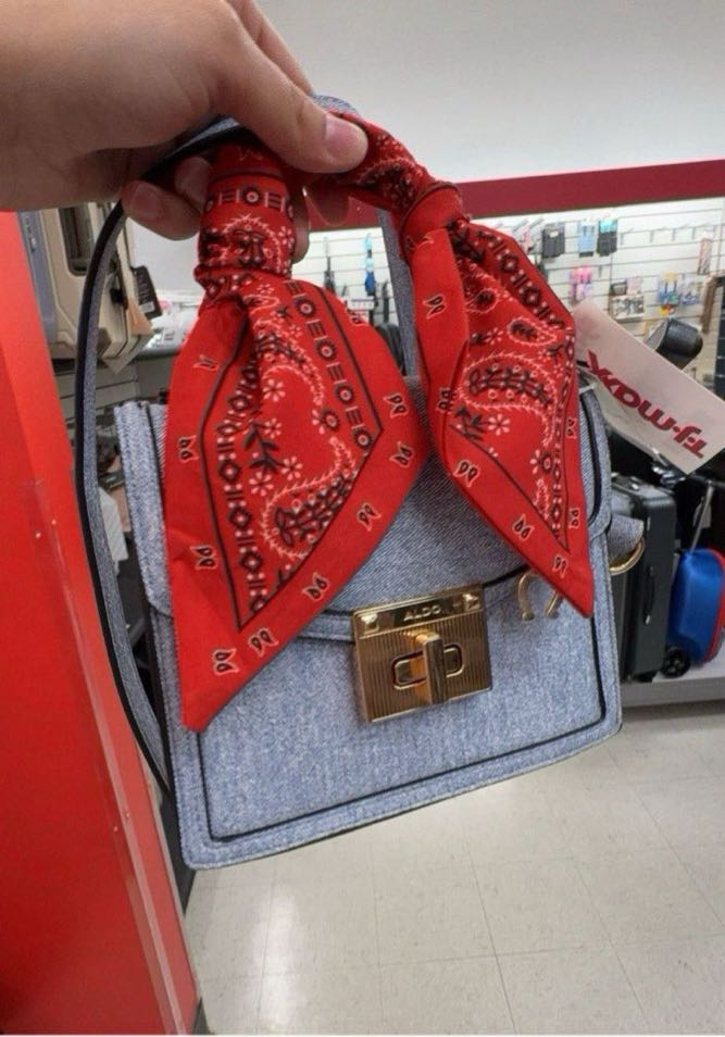 A stylish denim handbag featuring a decorative red bandana tied around the handle.