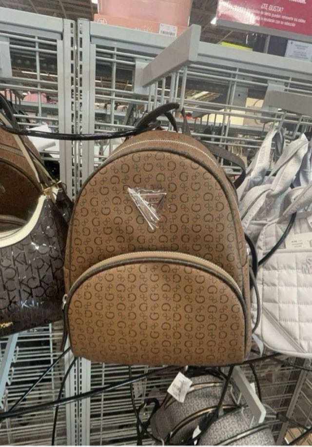 A stylish brown backpack featuring a logo pattern and a sleek design, perfect for everyday use.