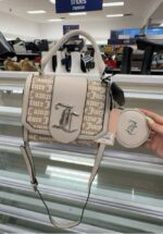 A stylish handbag featuring a logo print and a detachable coin purse.