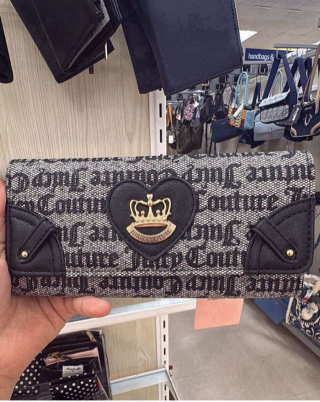 A stylish wallet featuring a black and gray design with a heart emblem and text print.