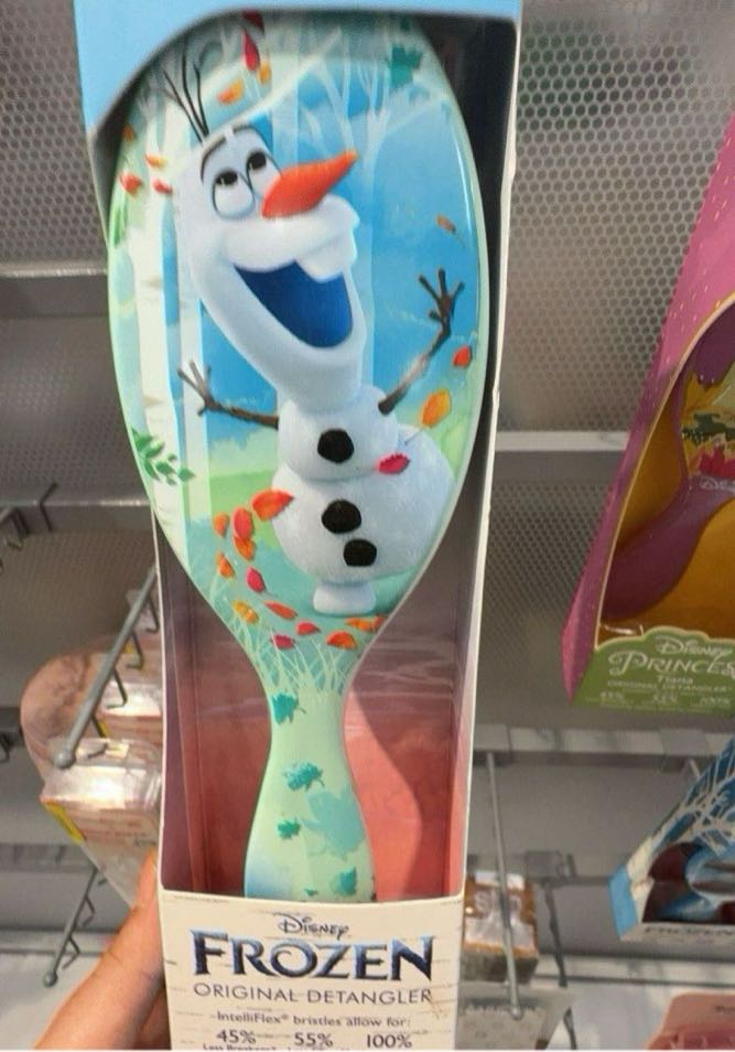 A colorful detangling brush featuring Olaf from Disney’s Frozen, designed to gently detangle hair.