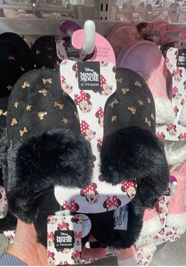 Cozy black slippers featuring a Minnie Mouse design with gold stars. Perfect for keeping your feet warm and stylish.