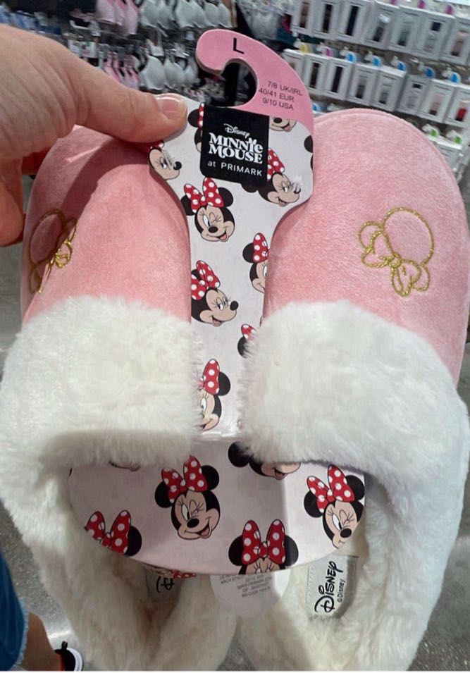 Cozy pink slippers featuring a Minnie Mouse design with soft faux fur lining. Perfect for keeping your feet warm and stylish.