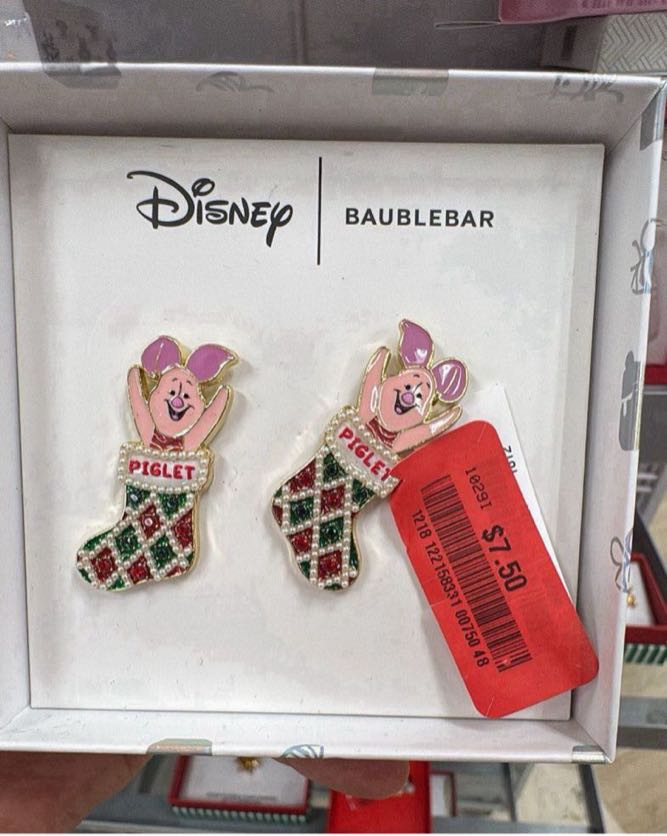 Cute earrings featuring Piglet in a festive stocking design, perfect for the holiday season.