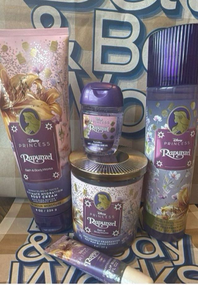 A collection of bath and body products featuring Rapunzel from Disney’s Princess series, including body cream, body wash, and more.