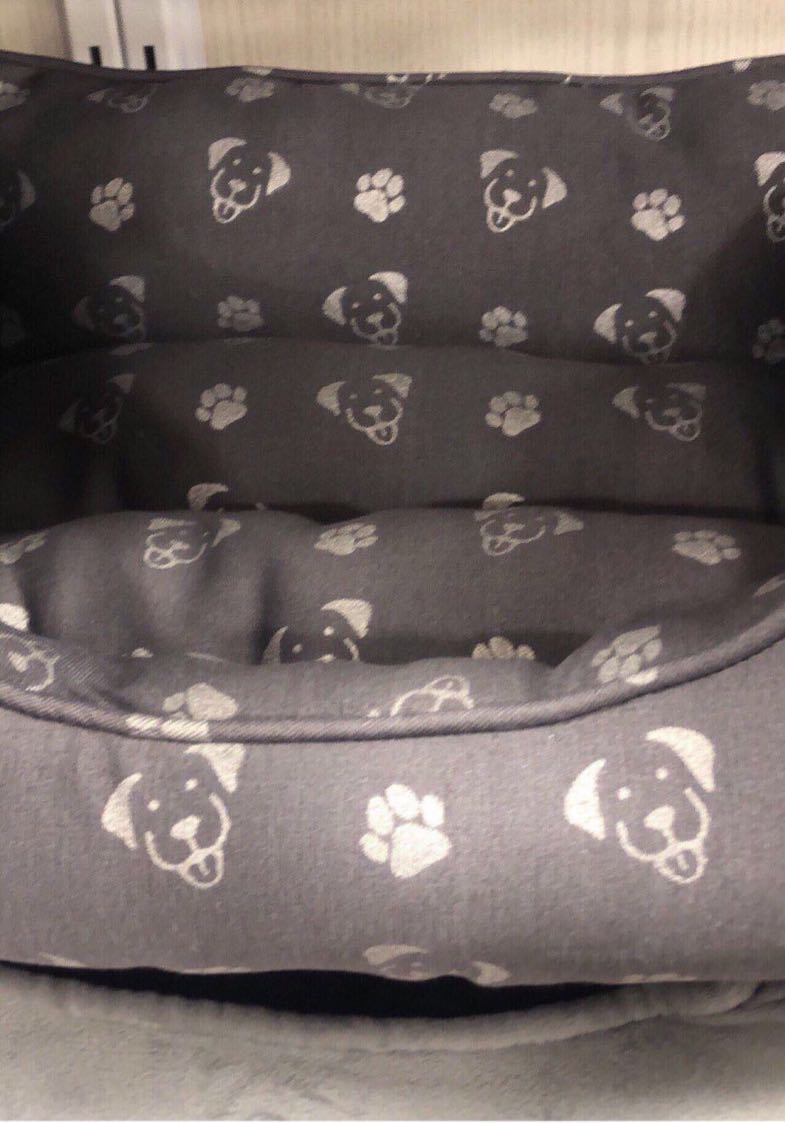 A cozy dog bed featuring a gray fabric with a playful paw print and dog face pattern.