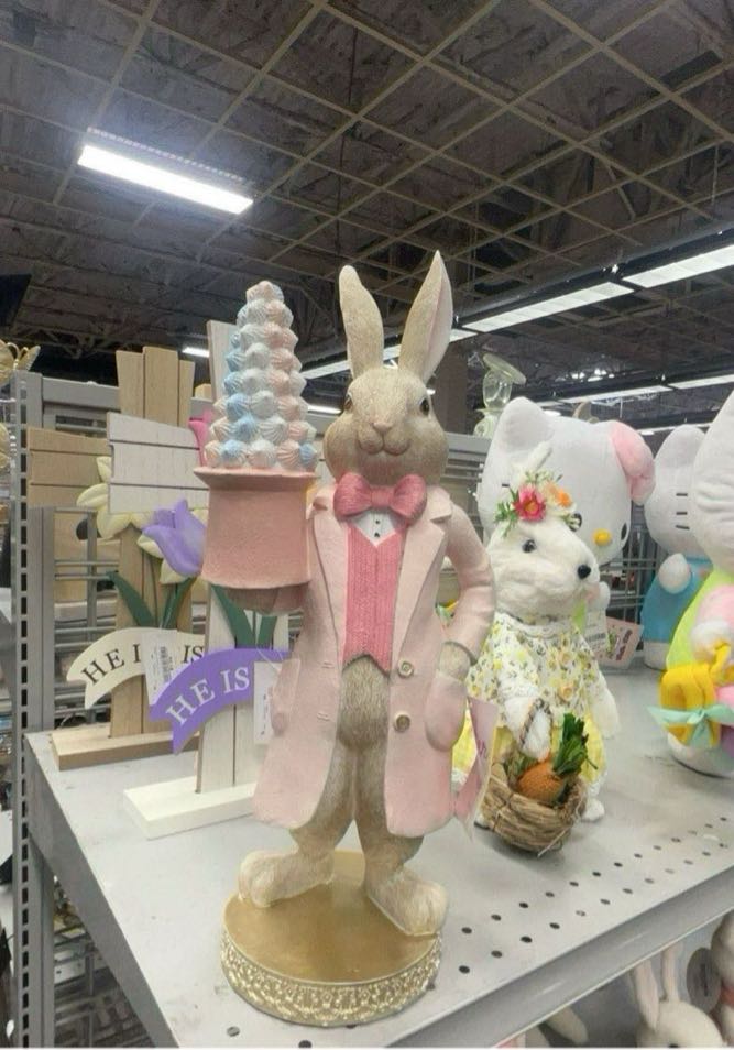 A decorative Easter bunny figurine dressed in a pink coat and bow tie, holding an ice cream cone.