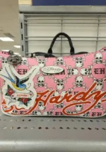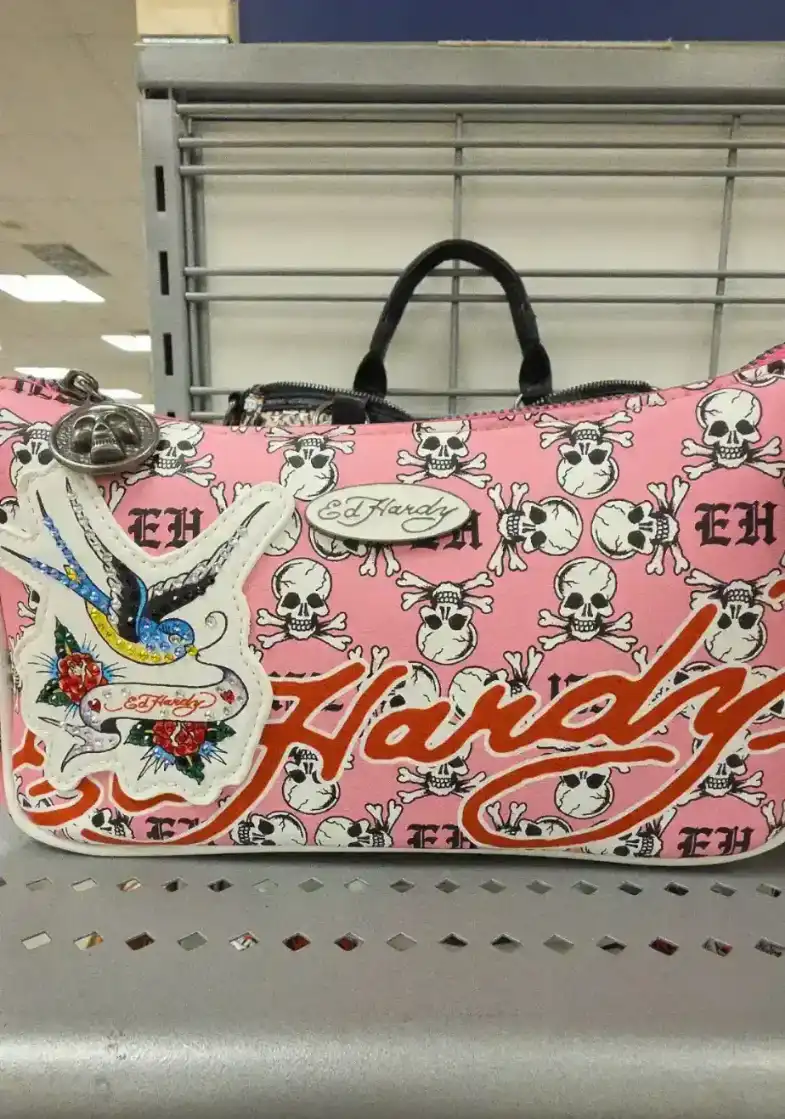 A stylish Ed Hardy handbag featuring a pink skull and tattoo design with a decorative swallow and floral accents.